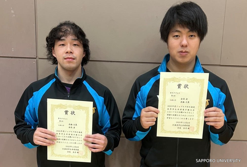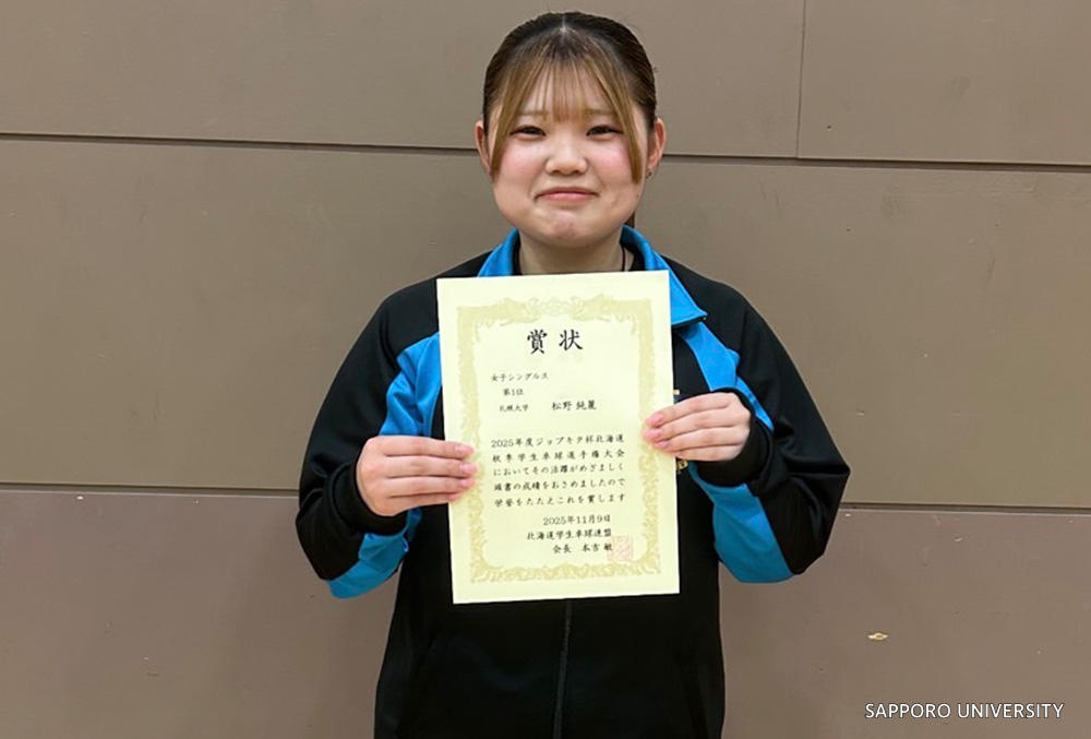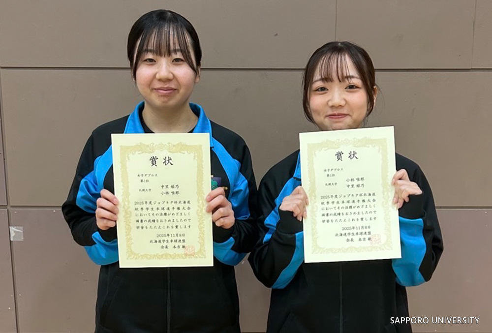 令和7年11月8日(土)・9日(日)の2日間、札幌市厚別区体育館で開催された「2025年度ジョブキタ杯北海道秋季学生卓球選手権大会」において、本学卓球部が優秀な成績を収めました。個人戦全種目を制覇し、特に女子シングルスではベスト4を独占する快挙を達成しました。