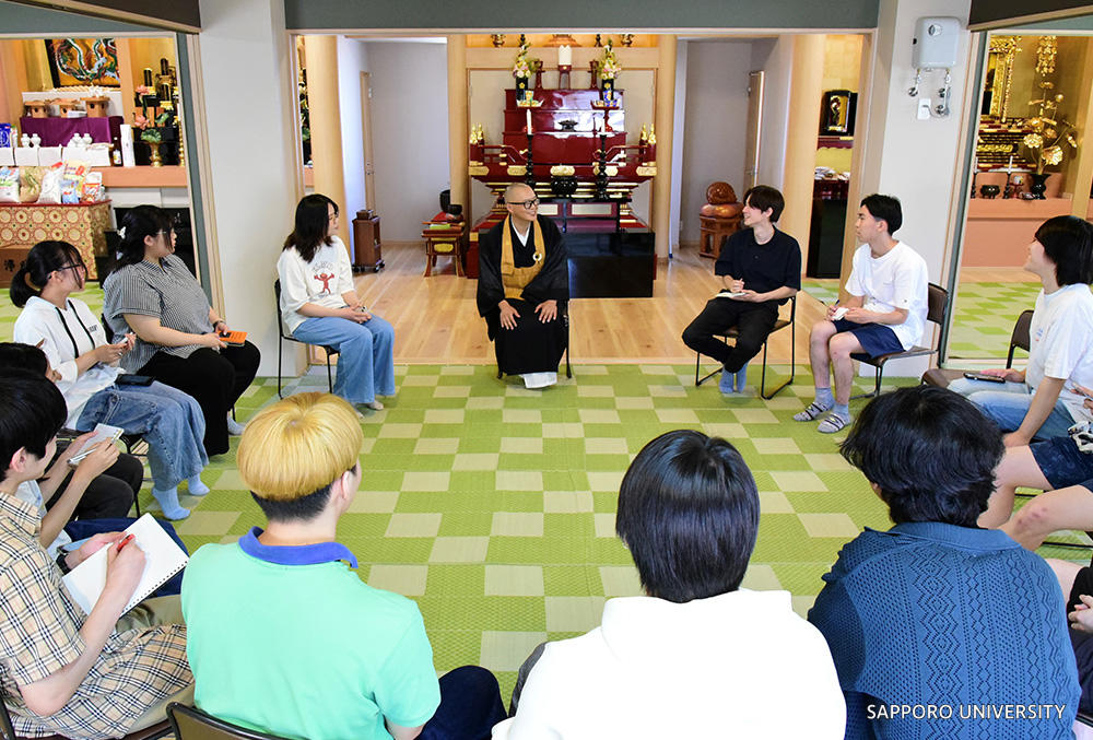学生たちは4月から準備を重ね、7月には南区の観音院を訪れて地域での多文化共生の実践に触れました。さらに夏休みには札幌マスジド(イスラム教のモスク)を訪れ、イスラム教の教えや文化、ハラールフードについて理解を深め、ムスリムの方々と直接対話を重ねました。ディスカッションやインタビューを通して、「知らないことを知る」「わからないことを尋ねる」という姿勢を大切にしながら、異文化理解を深めています。