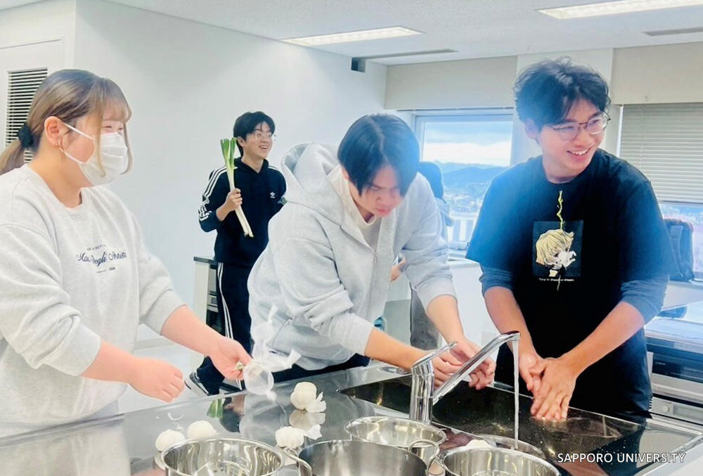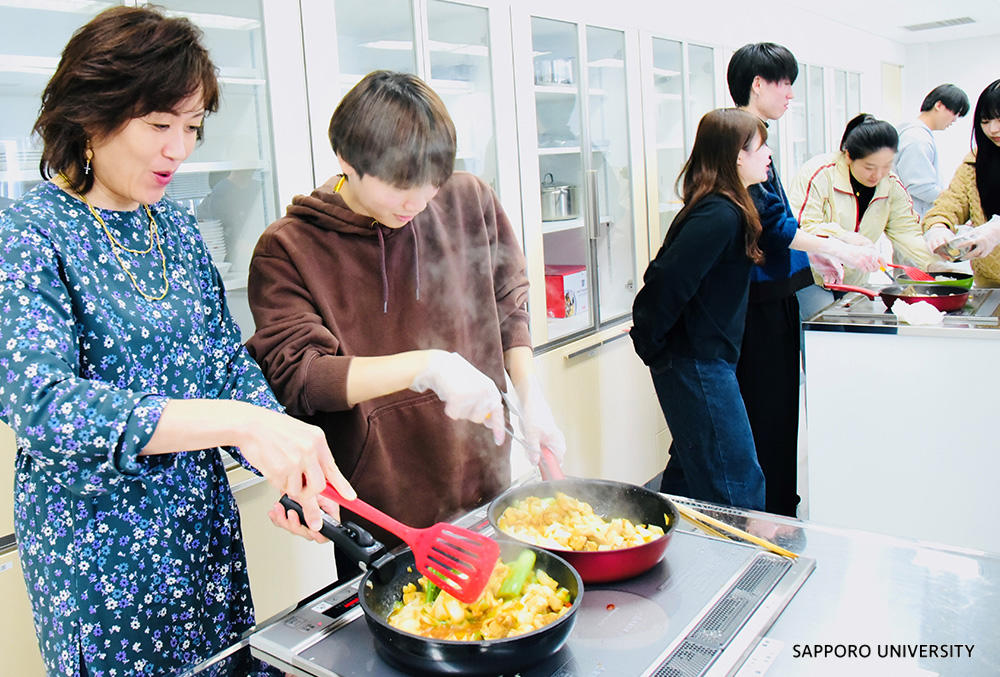10月8日のプレイベントには、観音院の住職・広沢義宗氏と札幌市議会議員で管理栄養士の資格をもつあおいひろみ氏をお招きし、講話とフィードバックをいただきました。学生たちは、タイのガパオライス、中国のダーパンジー、日本のハラールコロッケなど、多文化の料理をハラールの手法で調理し、参加者全員で試食を行いました。