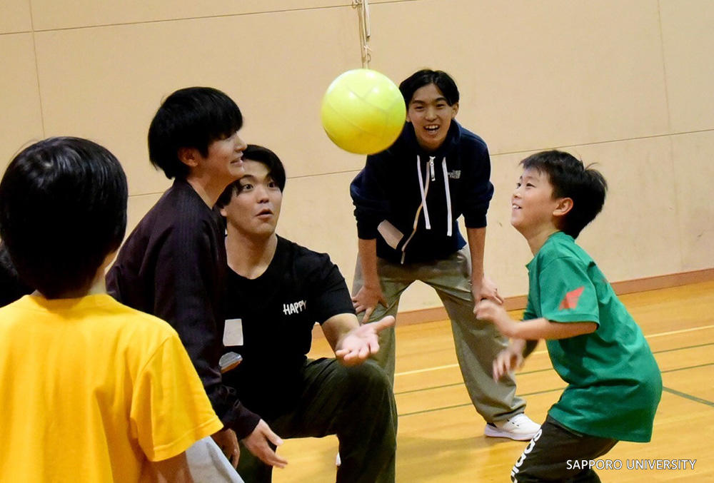 体育室では、学生が工夫を凝らして考案した「手づくりゴルフ」や、力と笑いの「大根抜きゲーム」、そしておなじみの「ドッジボール大会」で大盛りあがり。転がるボールと笑い声が絶えず、子どもも学生も夢中になって遊びました。