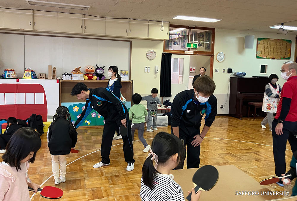 令和7年11月17日(月)、留萌市のかもめ幼稚園において、本学卓球部による卓球教室を開催しました。