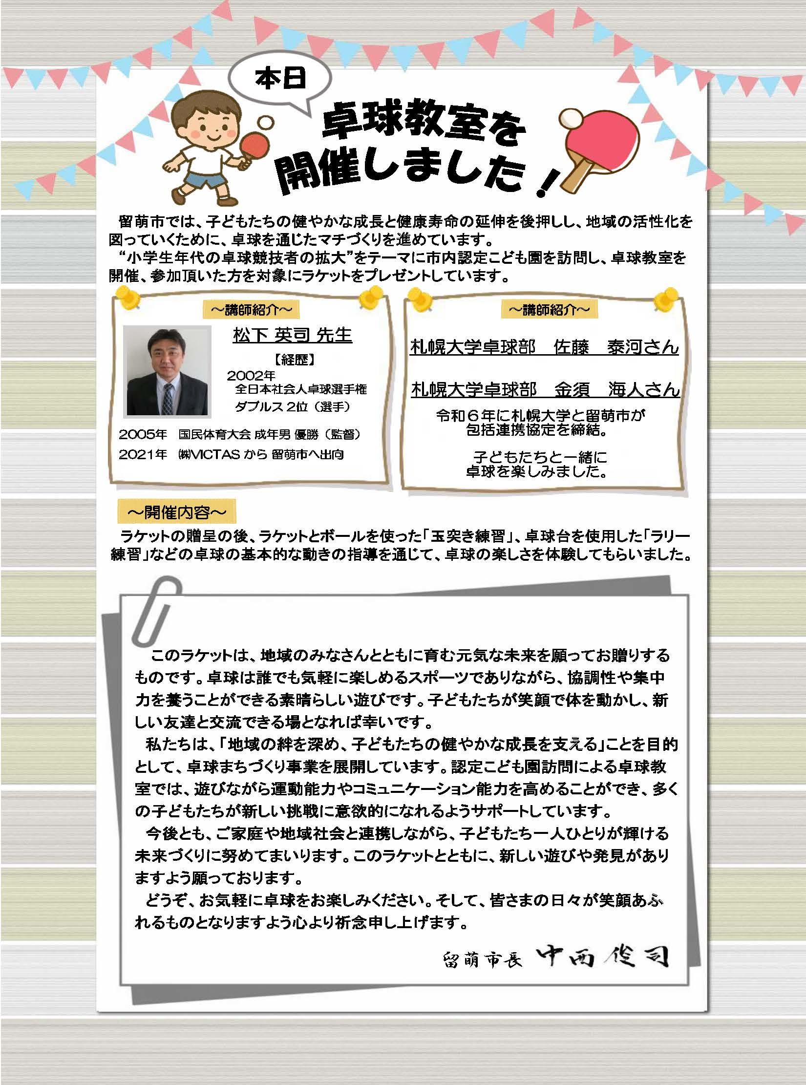 当日は、年長クラス26名が参加し、ラリー体験やボール遊びなどを通して、全員が楽しく卓球に親しむ姿が見られました。また、参加した園児には留萌市より卓球ラケットが贈呈され、市長からのメッセージも届けられました。