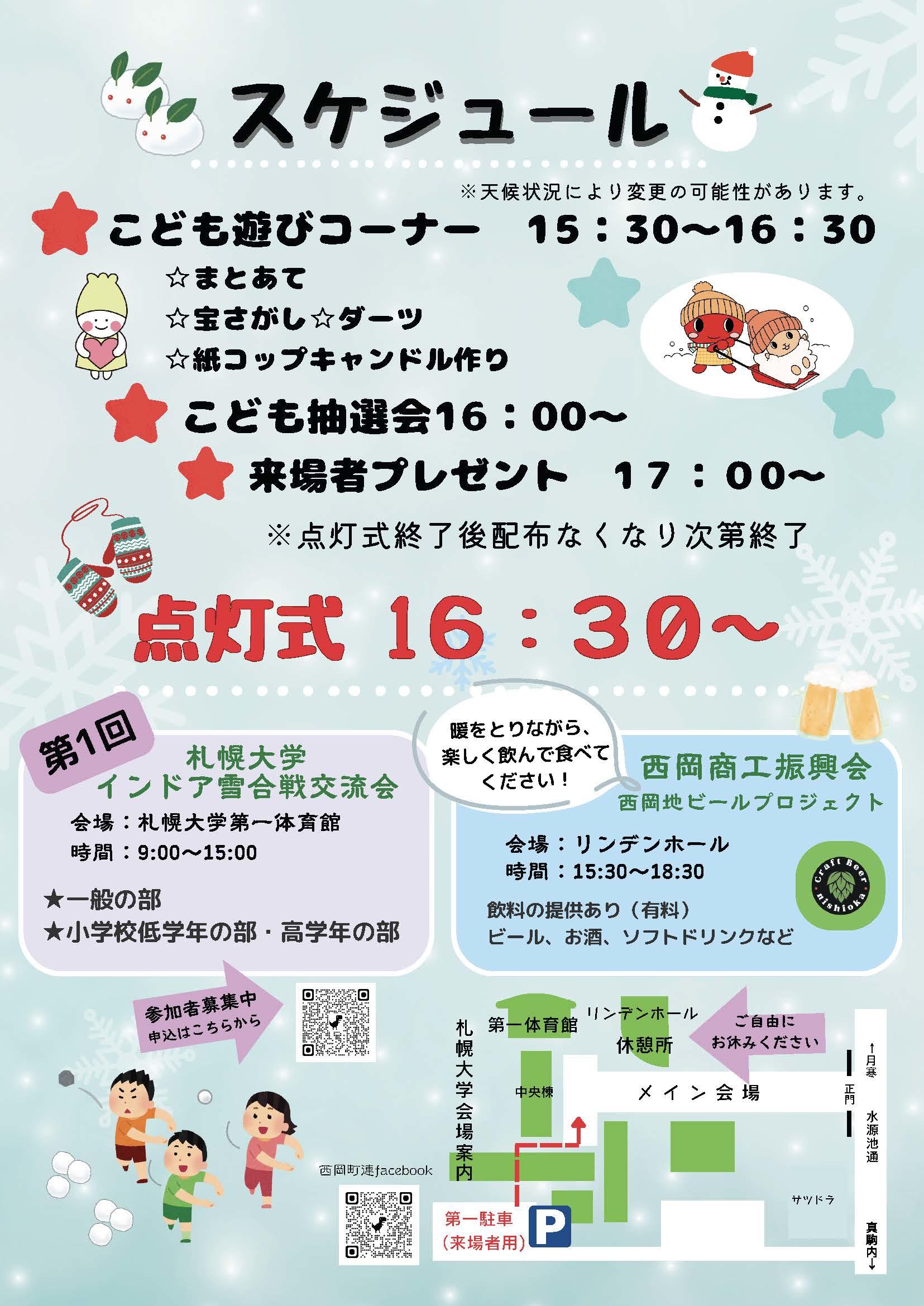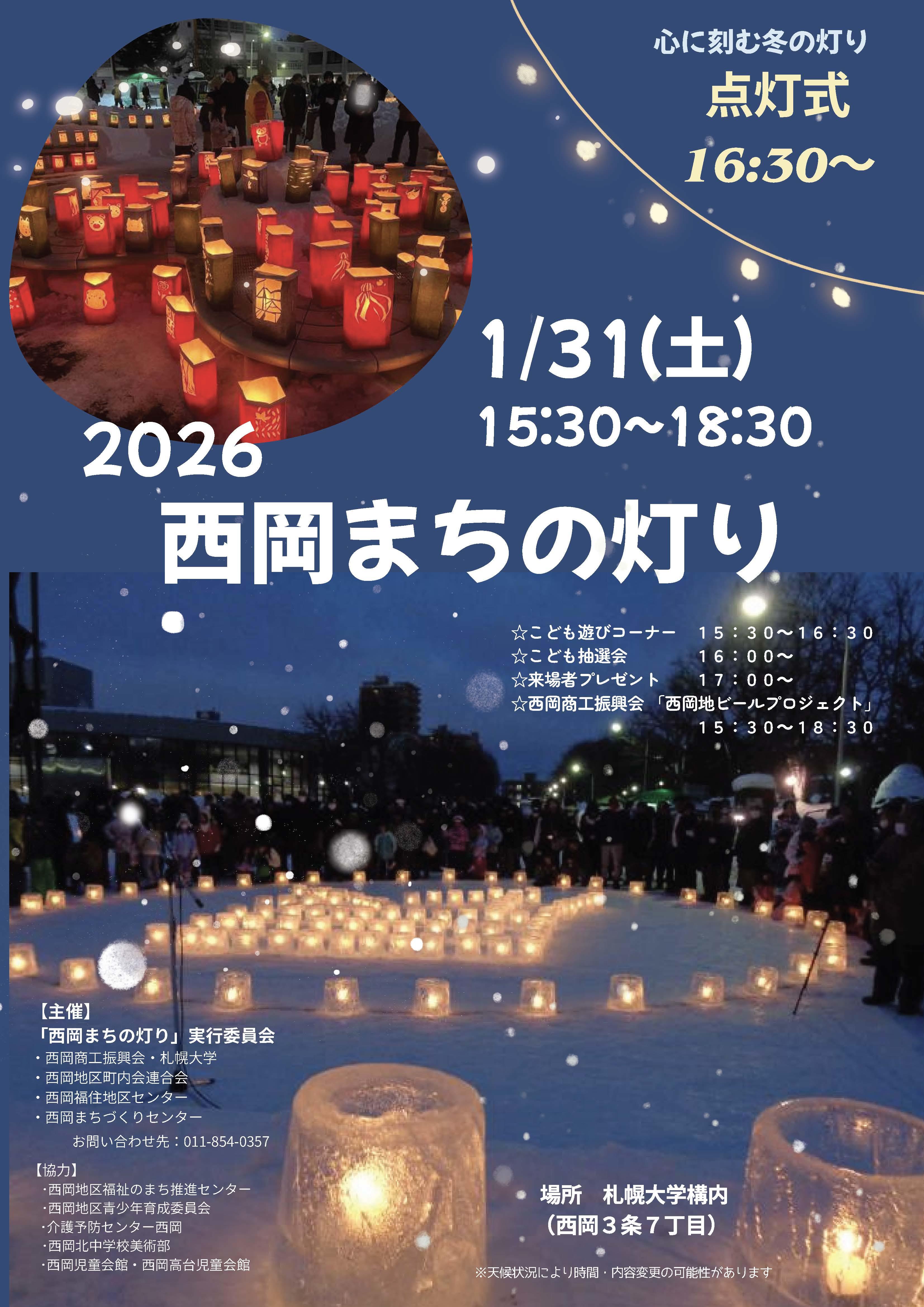 | 主催 | 「西岡まちの灯り」実行委員会 西岡商工振興会・西岡地区町内会連合会・札幌大学・西岡福住地区センター・西岡まちづくりセンター |