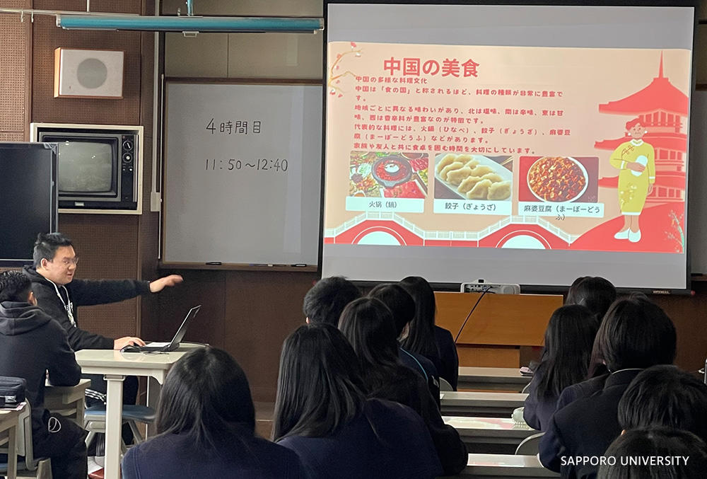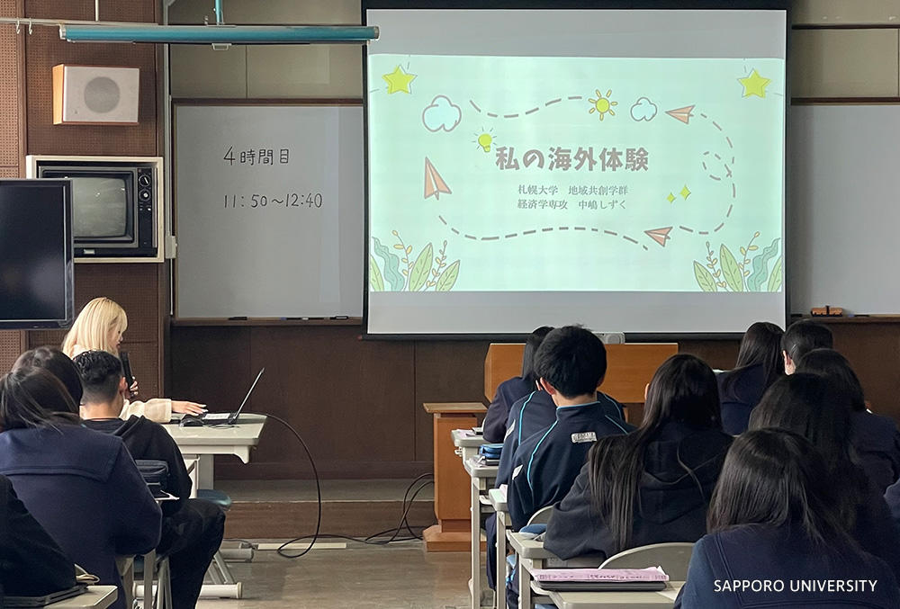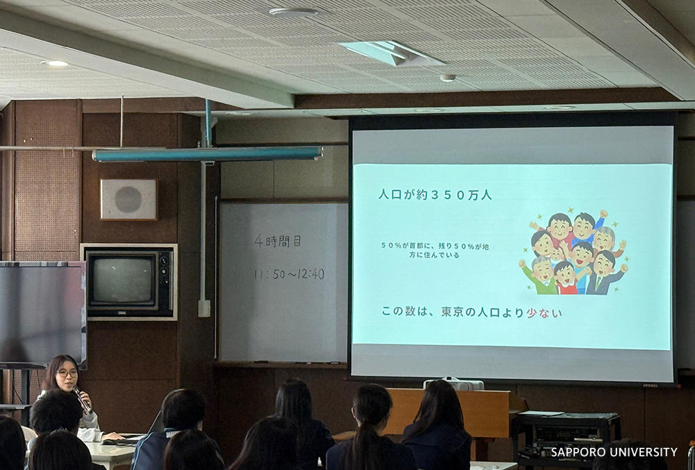 北海道札幌丘珠高等学校との高大連携事業の一環として、本学学生3名が同校を訪問し、3年生の選択科目「地域文化研究」を受講する生徒43名を対象に出前講義を行いました。