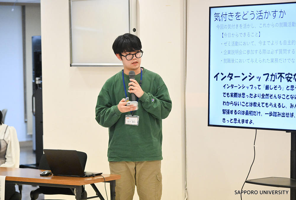 本報告会は、本学が加盟する北海道地域インターンシップ推進協議会の取組に基づき、実習に参加した学生が現場での学びや自身の課題を振り返り、今後の学びへとつなげることを目的に実施したものです。また、参加を検討している在学生に対し、インターンシップへの理解促進や参加意欲の向上を図る狙いもあります。