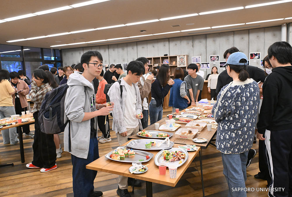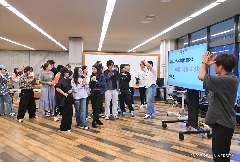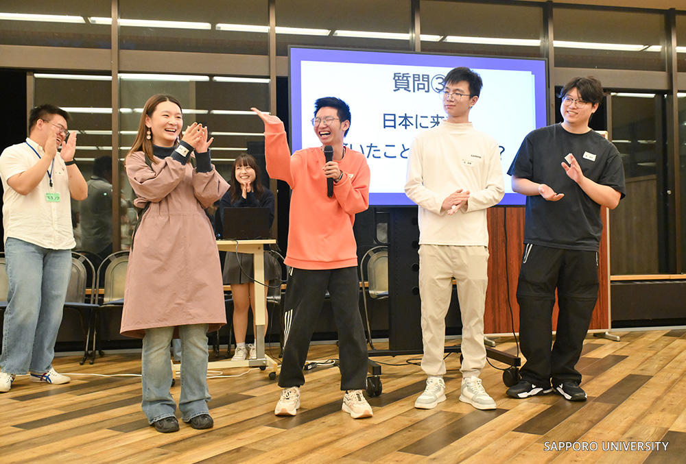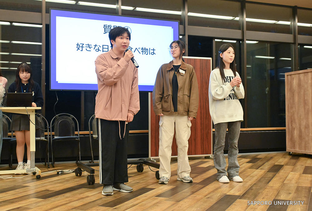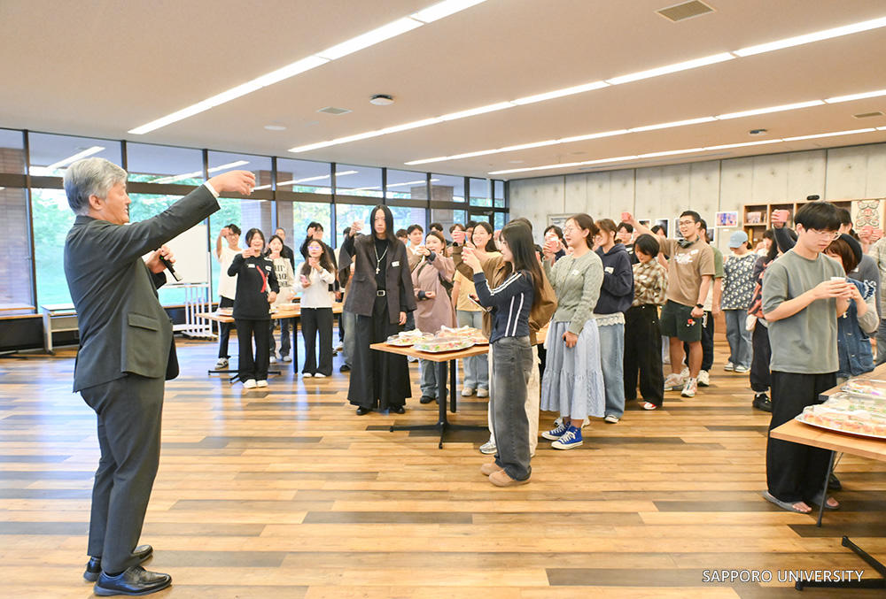 最初に大森学長による歓迎挨拶・乾杯が行われ、和やかな雰囲気の下、新入留学生は本学学生や教職員と歓談し、また、留学生同士でも交流を深めました。歓迎会の後半には札幌大学等に関する〇×クイズ、新入留学生の個性あふれる自己紹介などで盛り上がり、参加者一同楽しいひとときを過ごしました。