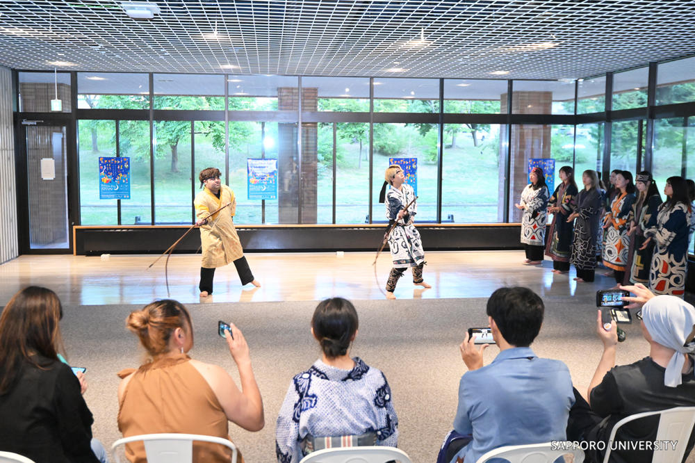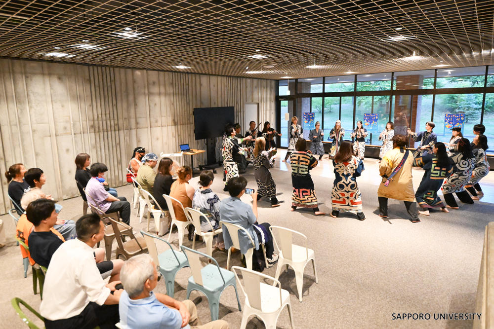 続いて、学生立志テラスS-wingにおいて、ウレシパクラブの学生19名がアイヌの歌や踊りを披露しました。完成度の高い表現に、来場者の皆様から感嘆の声や拍手が寄せられました。