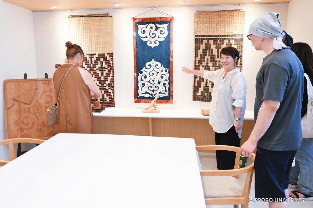 まず始めに、学内アイヌ工芸品見学ツアーでは、本学の本田優子教授による解説を交えて、シマフクロウの木彫やアイヌの伝統的な住居「チセ」など、本学でしか見られない数々の貴重な品をご覧いただきました。