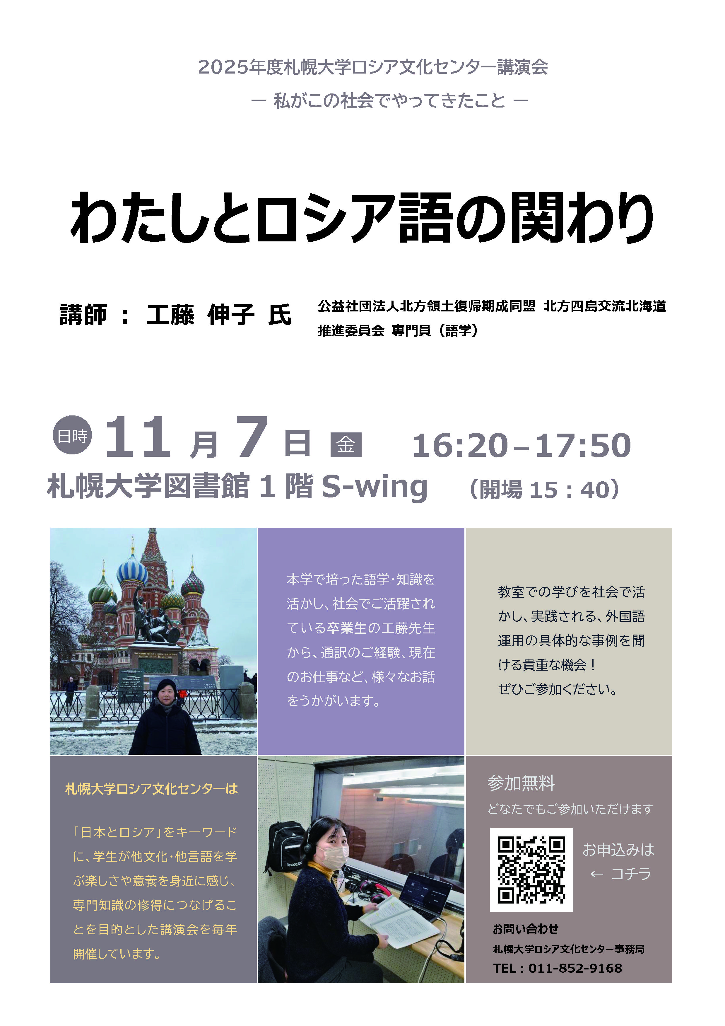 11月7日(金)に、本学で培った語学・知識を活かし社会でご活躍されている卒業生を講師にお招きし、講演会を開催します。 札幌大学ロシア文化センターでは、「日本とロシア」をキーワードに、学生が他文化・他言語を学ぶ楽しさや意義を身近に感じ、専門知識の修得につなげることを目的とした講演会を毎年開催しています。今年はロシア語通訳のご経験、現在のお仕事など、教室での学びを社会で活かす貴重なお話をうかがいます。 入場無料、一般の方もご参加いただけます。ぜひご来場ください。 問い合わせ先 札幌大学ロシア文化センター事務局 TEL:011-852-9168