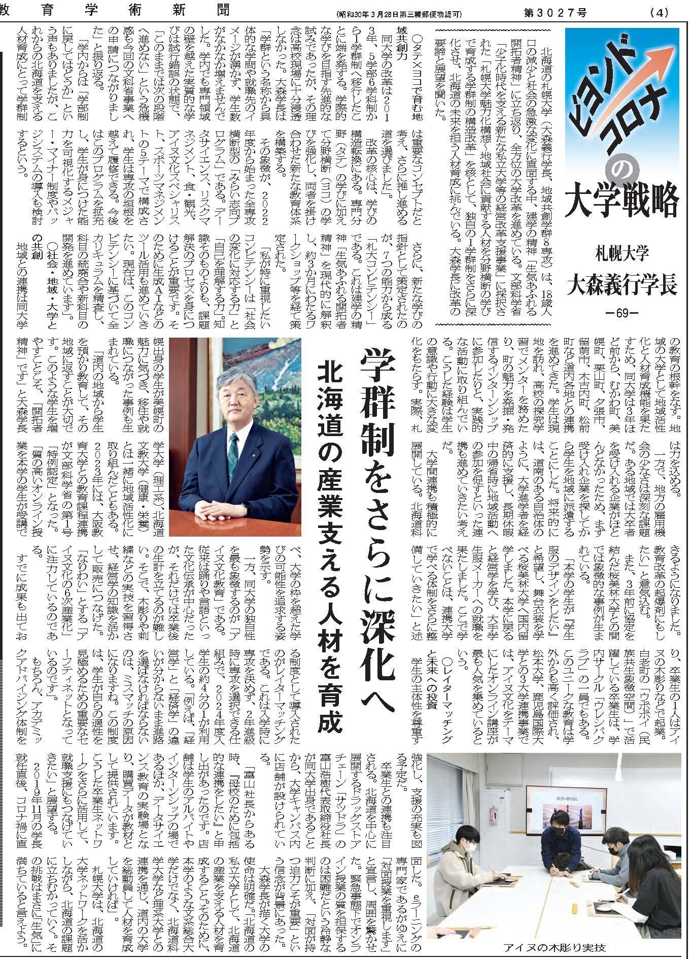 記事では、令和7年1月に文部科学省による「令和6年度少子化時代をキラリと光る教育力で乗り越える私立大学等戦略的経営改革支援」事業に採択された「札幌大学魅力化構想~地域社会に貢献する人材を分野横断の学びで育成する学群制の構造改革~」のもと、本学で学ぶことにより学生が身につける力を「札大コンピテンシー」として策定し、地域や他大学と連携を深めながら取り組んでいる本学の改革の足取りについて、大森義行学長が取材に応じています。