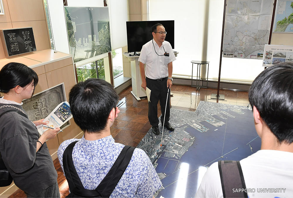 当日は、まず北海道開発局小樽開発建設部の小樽みなと資料館を見学し、小樽港の歴史や防波堤の特色について学びました。