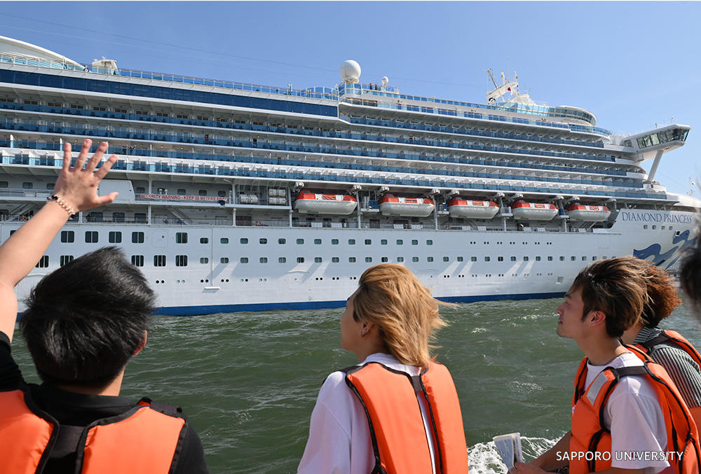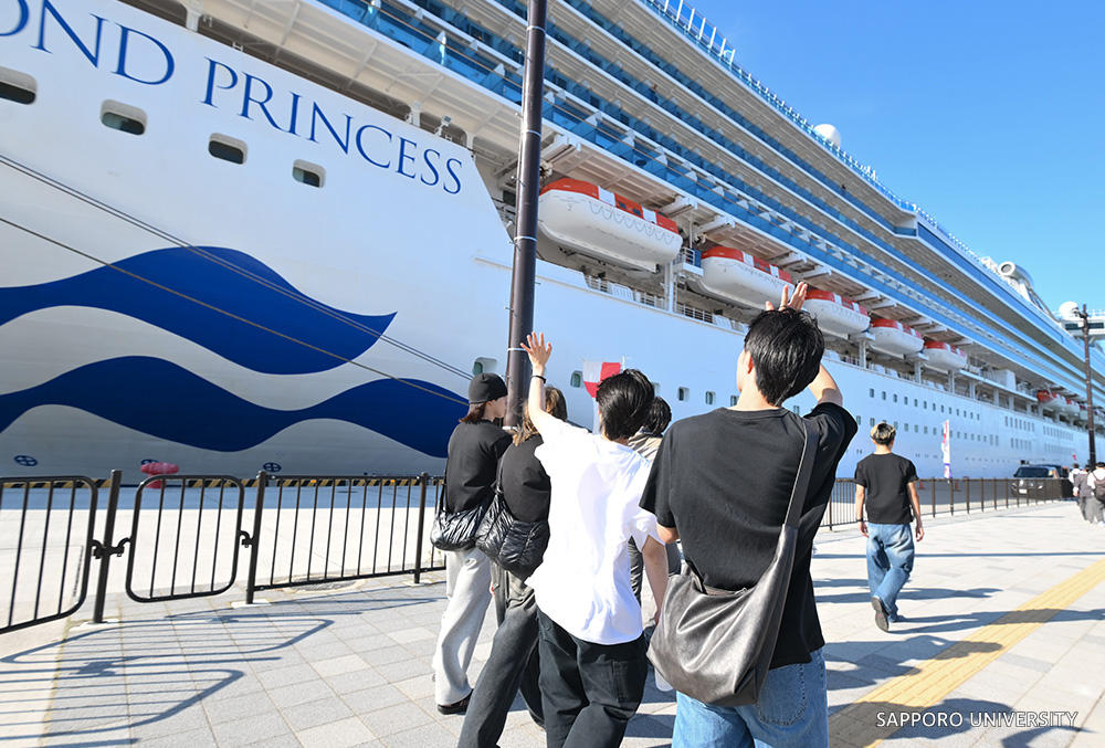 本学では全専攻横断型プログラムとして「食・観光プログラム」を展開しています。この度、同プログラムの一環で経済学専攻専門科目「旅行業界演習」の授業において、2025年7月に小樽港と停泊しているクルーズ船の視察を船上から行いました。