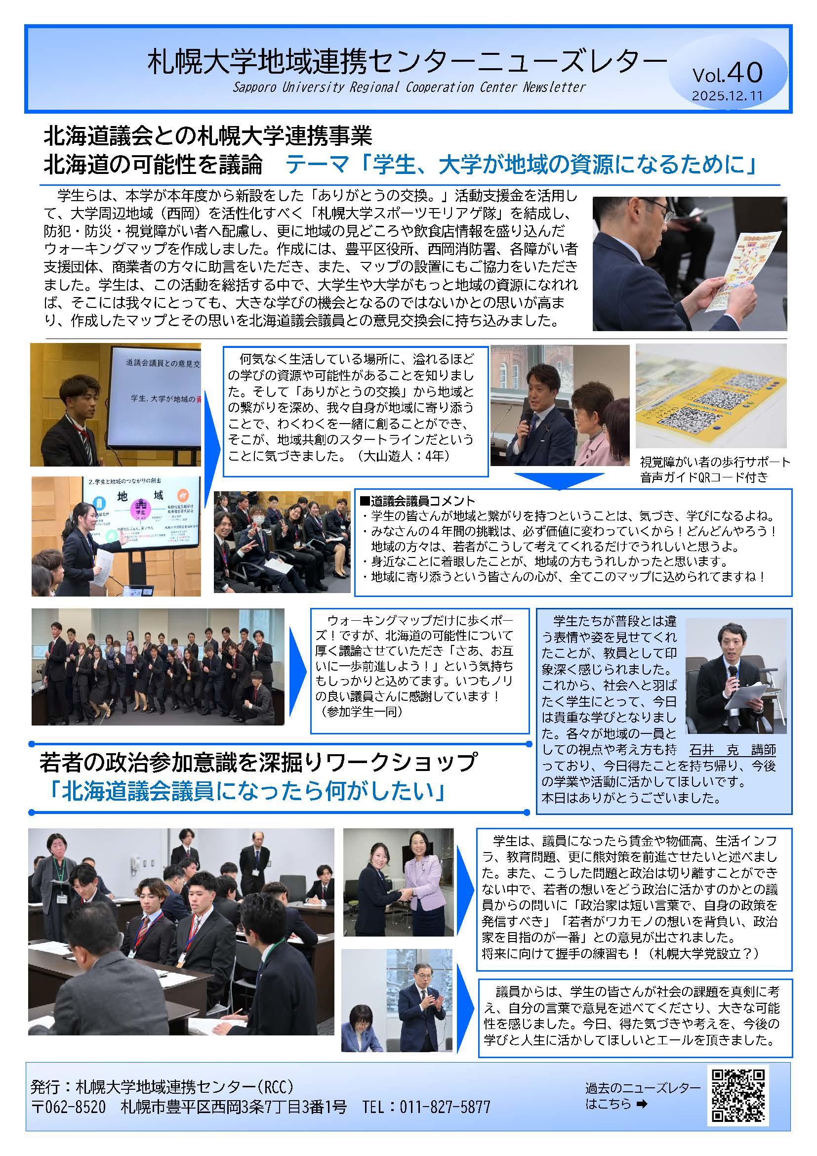 地域連携センターで発行しているニューズレター、今回は、本学と北海道議会との包括連携協定に基づく取り組みとして、本学学生が北海道議会議員の方々と北海道の課題や可能性に対する施策、若者の政治参加をどう進めるべきかの意見交換を実施いたしました。