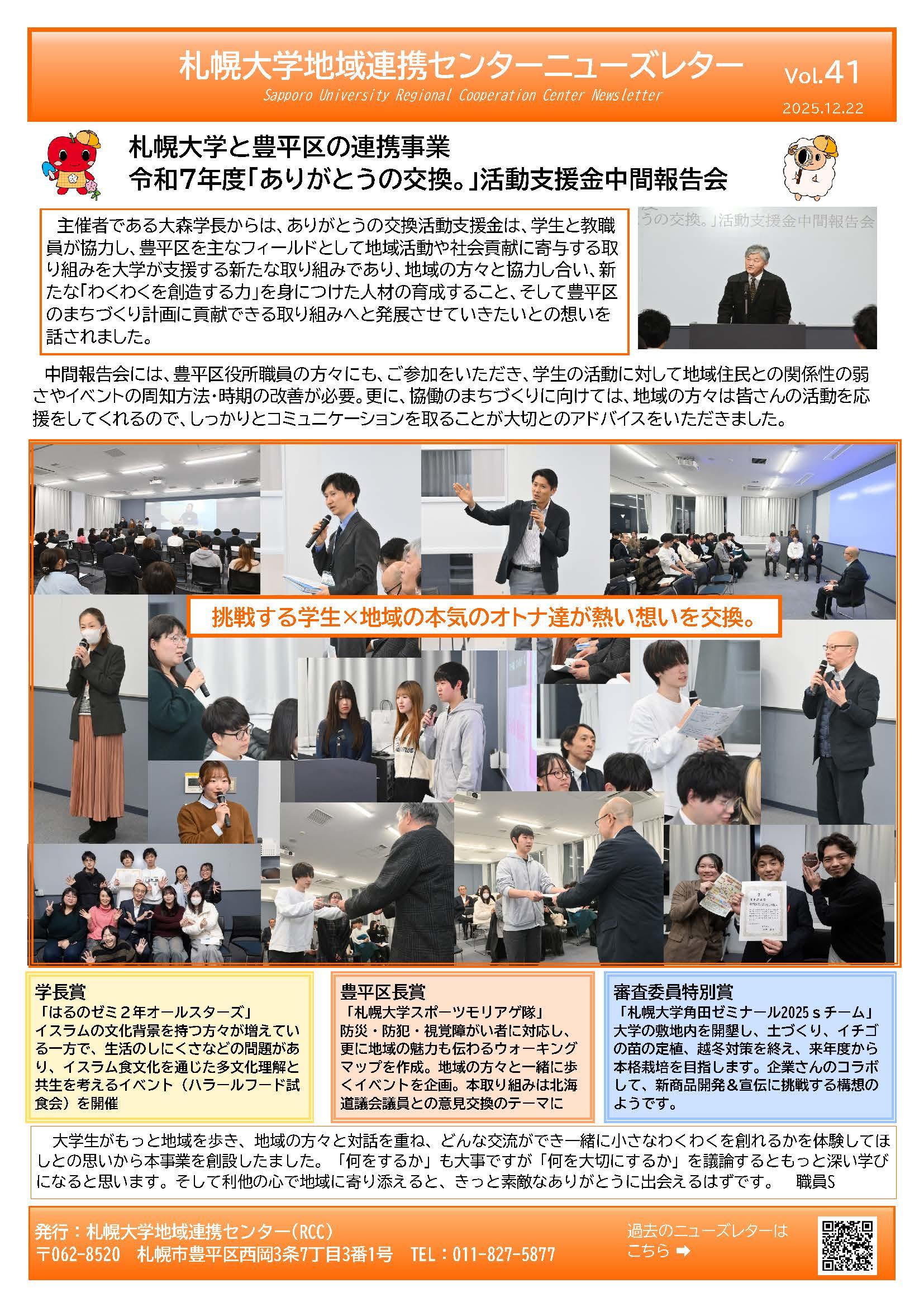 地域連携センターで発行しているニューズレター、今回は、本学と豊平区の連携事業であります、「ありがとうの交換。」活動支援金中間報告会を豊平区役所職員の方々にもご参加をいただき開催いたしました。