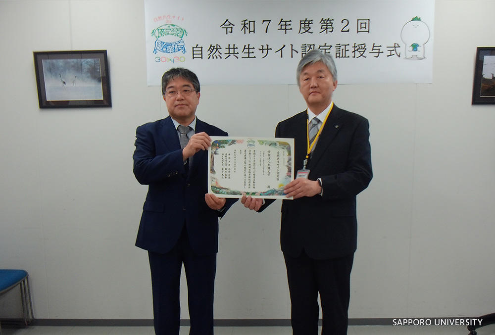 2025年12月23日(火)に、環境省北海道地方環境事務所において、自然共生サイト認定証授与式が開催され、本学から大森学長、学生2名、職員2名が出席しました。