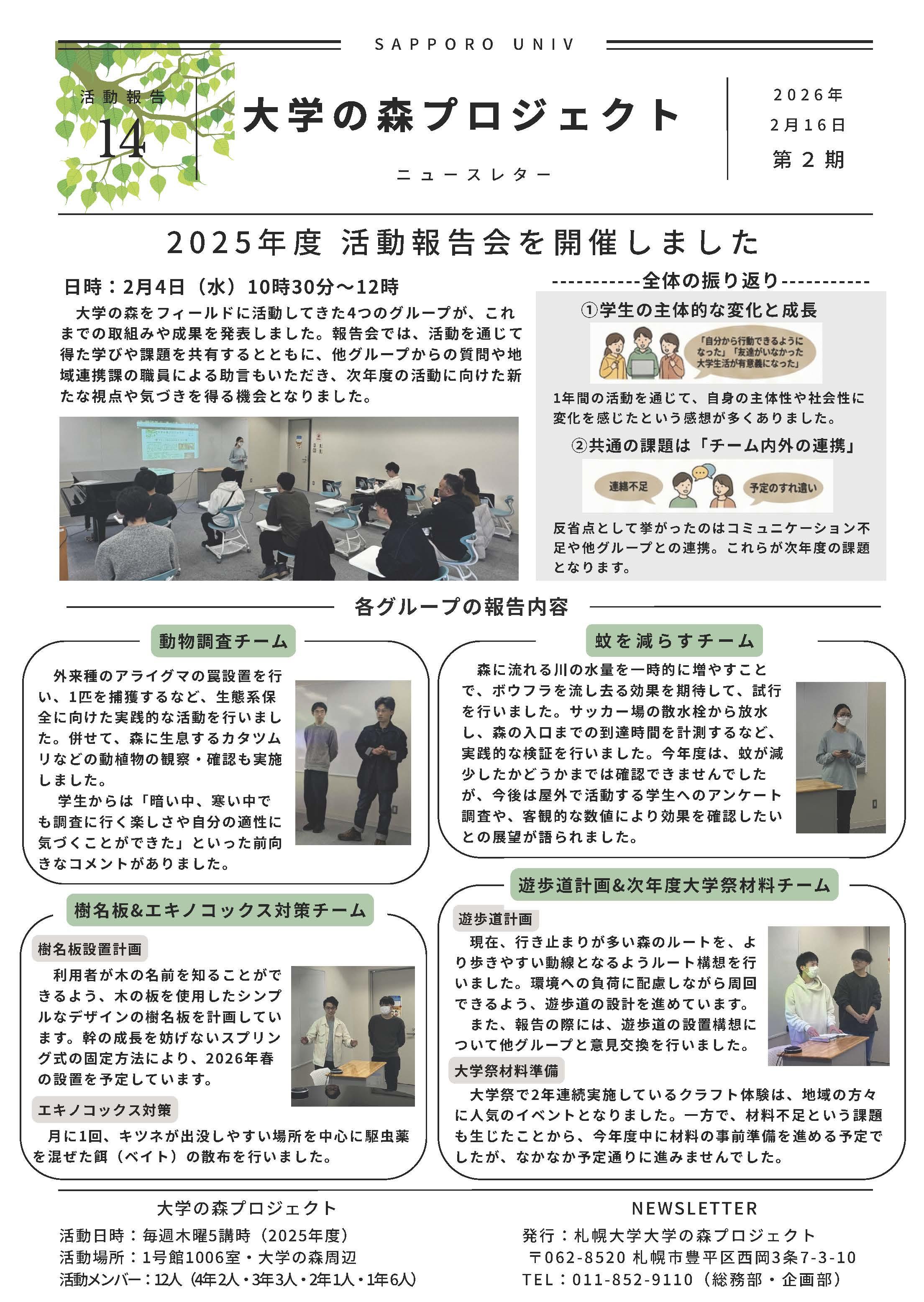 「大学の森プロジェクト」第14号ニュースレターでは、2月4日に開催された2025年度活動報告会について掲載しています。動物調査や樹名板設置、蚊の対策、遊歩道計画等に取り組んだ4グループが成果を発表しました。質疑応答をする中で、学生たちは取り組んだ活動の意義や自身の成長を実感するとともに、次年度に向けた改善点や新たな視点を共有する機会となりました 。ぜひご覧ください。