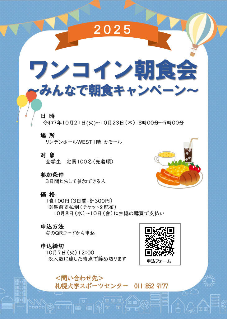 この企画は、札幌市が市民の朝食習慣化を図ることを目的に進めている企画、「さっぽろウェルネス★朝ごはんプロジェクト」に本学が賛同し、開催することになったもので、日本ハム株式会社の協力によりシャウエッセン®(ウインナー)をご提供いただき、札幌大学学生生協がバランスの良い朝ごはんをテーマとした、コラボメニューを用意しているものです。