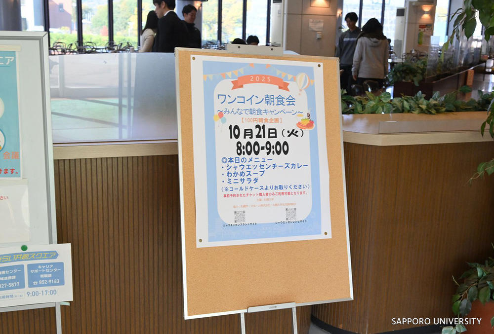 令和7年10月21日(火)から23日(木)までの3日間、札幌大学学生食堂において、学生の朝食習慣の定着を目的とした「ワンコイン(100円)朝食会~みんなで朝食キャンペーン~」を開催しました。