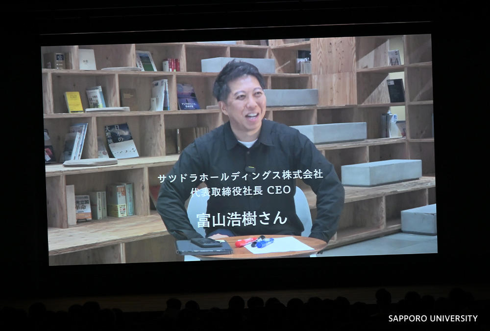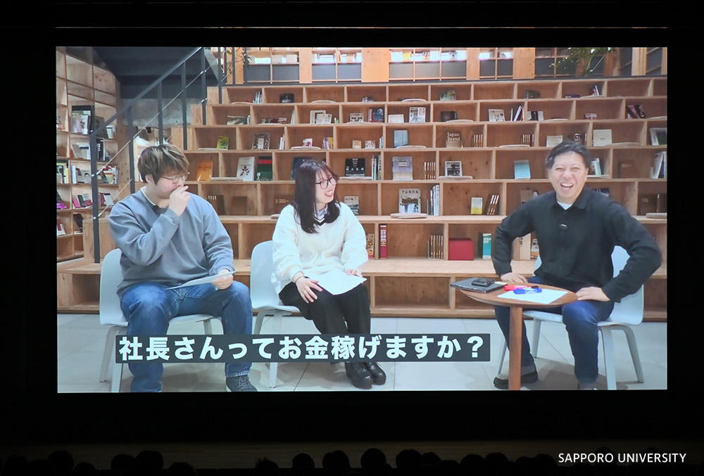 本学学生二人がサツドラ本社に伺って富山社長にインタビューをした事前収録動画を、会場で上映しました。