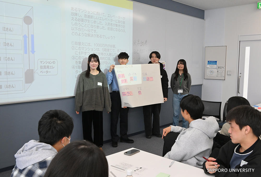 午後からは学群・専攻のグループごとに分かれ、昼食・学内見学・アイスブレイク等を行った後、富山社長のインタビューを聞いた感想を話し合ったり、各専攻独自のテーマについてディスカッションするなどのグループワークを行いました。