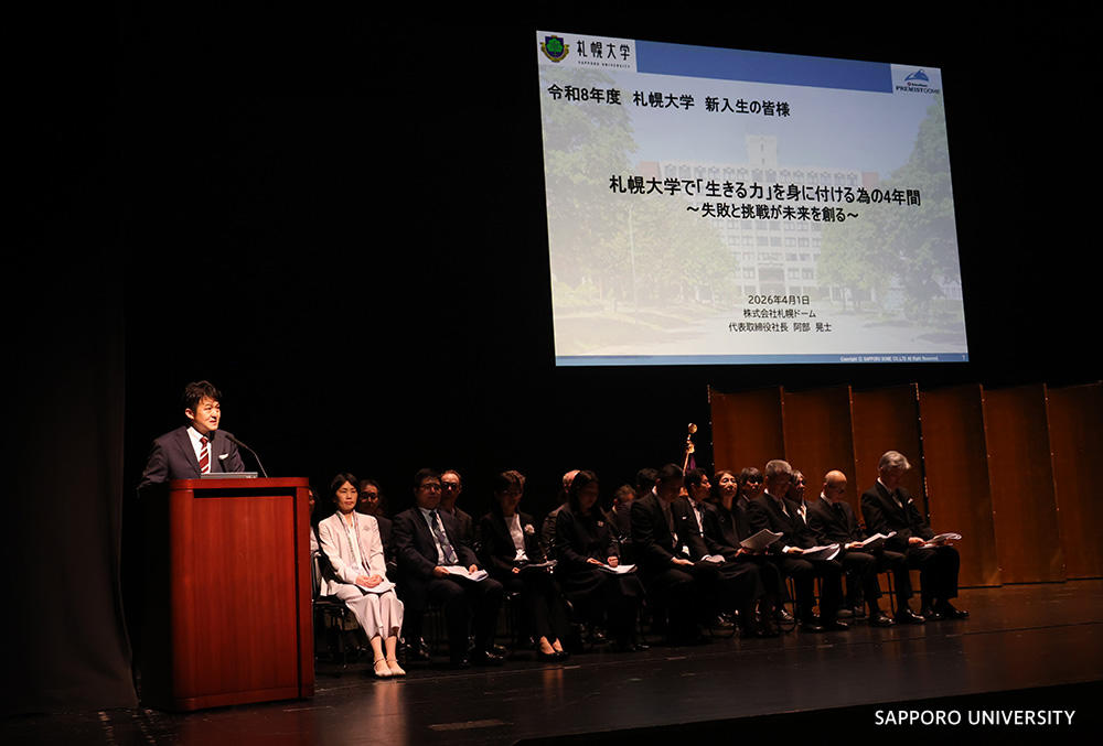今年の入学式では、特別講演として、本学卒業生で株式会社札幌ドーム代表取締役社長阿部晃士氏(1992年経営学部経営学科卒)を講師にお招きし、新入生やその保護者の方々へ、大学生活で身につけるべきこと、挑戦すべきことなどについてご自身の経験を交えて講演いただきました。